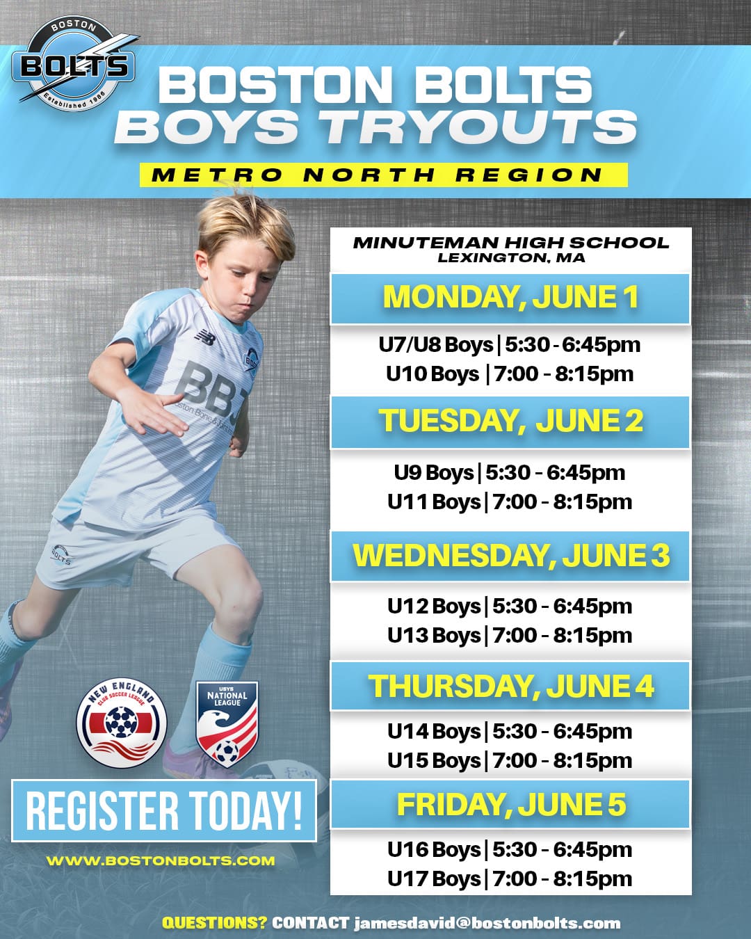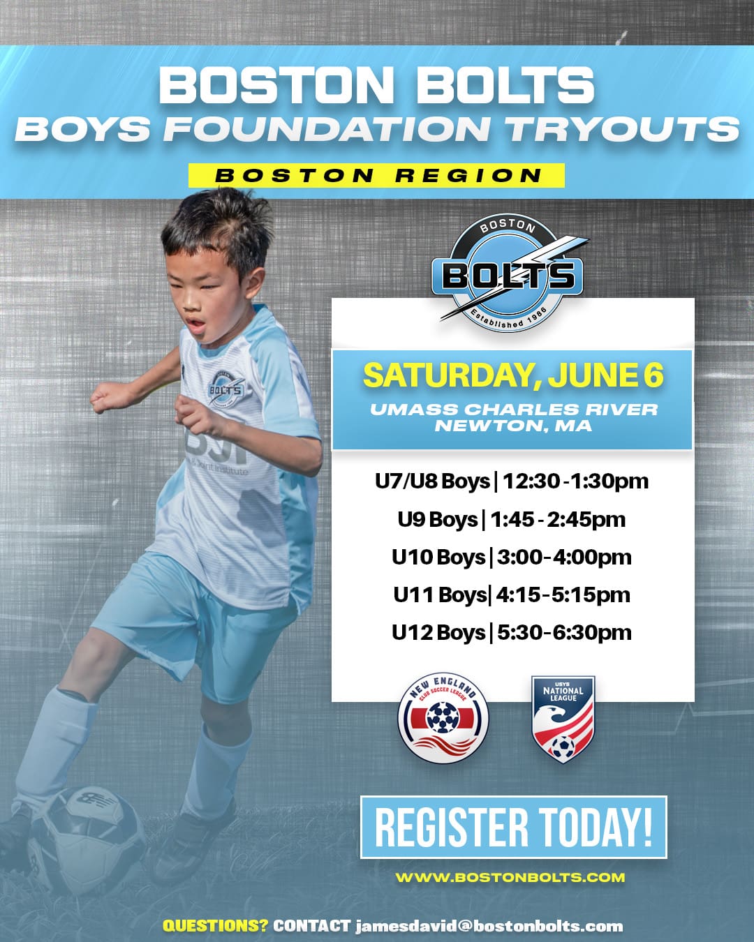 Join us for our upcoming Boston Bolts Tryouts and experience The Bolts Way! Our player-focused environment is built to help young athletes of all backgrounds grow, compete, and thrive. Each session is designed to evaluate players in an engaging, exciting, and supportive atmosphere while showcasing the key qualities we look for in future Bolts. With age-appropriate training and a commitment to long-term development, our tryouts are the first step toward becoming part of the next generation of Bolts players.