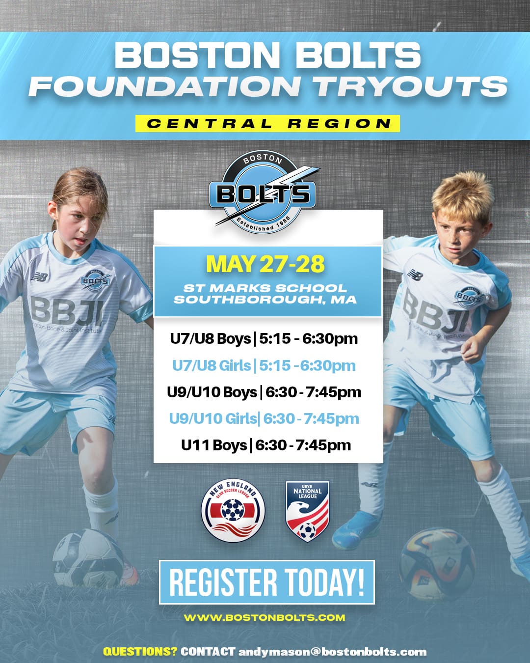 Boston Bolts is dedicated to developing all players from ages 5 through high school and beyond through high-level coaching, competitive league play, and a proven pathway that guides players from grassroots to collegiate and professional opportunities.